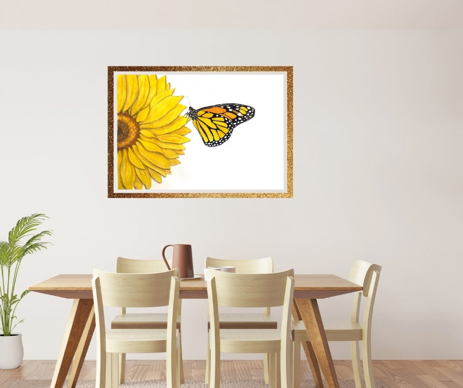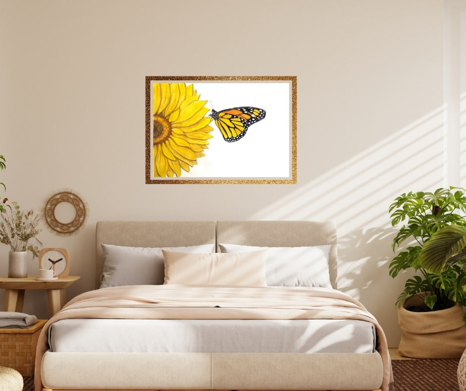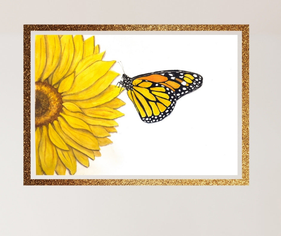 This vibrant watercolor celebrates a fleeting yet timeless moment in nature: a monarch butterfly pausing on a brilliant California Delta sunflower. Rich orange wings shimmer against the golden petals, while delicate brushwork captures the fragility and resilience of both flower and butterfly. The interplay of warm hues and soft shadows evokes the sunlit fields of the Delta in late summer, where pollinators and wildflowers thrive in harmony. At 18x24 inches, this piece radiates joy, life, and the quiet beauty of California’s natural landscapes.