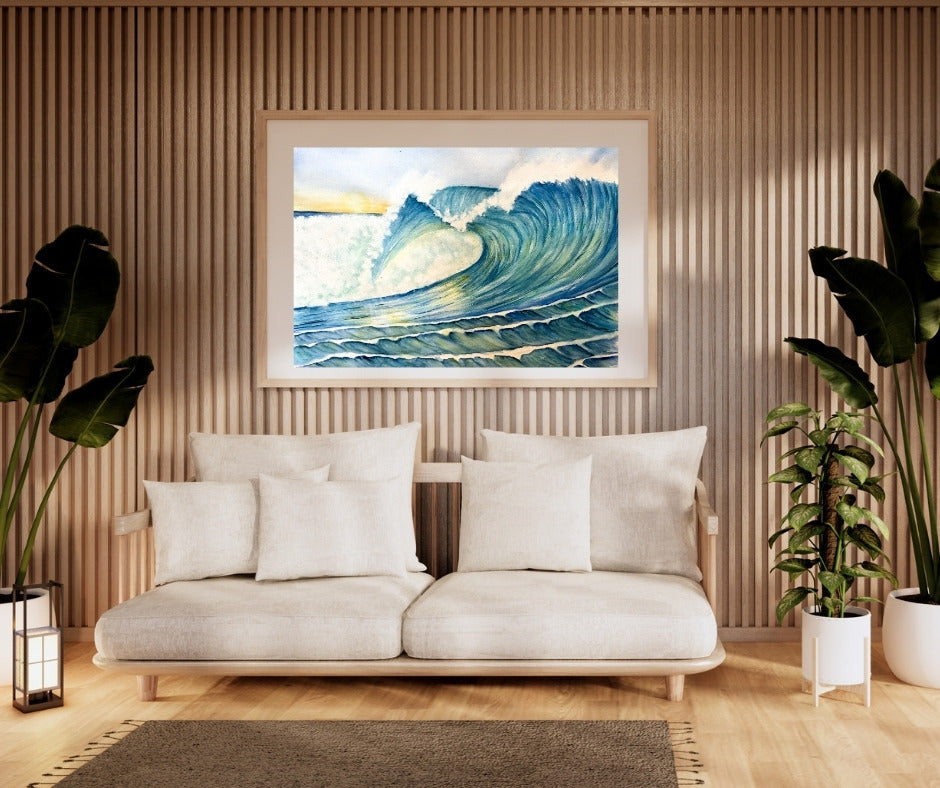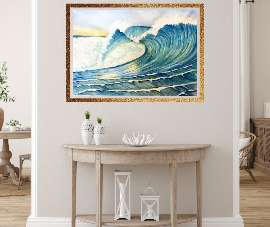 This dynamic watercolor captures the raw power and beauty of the ocean in motion. Turquoise and deep blue tones collide in a sweeping arc as the wave crests and crashes, filled with energy and light. Layered washes and fine detail evoke both the fluidity and the force of the sea, inviting the viewer to feel the spray and hear the rhythm of the surf. At 18x24 inches, this piece brings the drama of the coastline to life—a vibrant reminder of nature’s untamed strength.