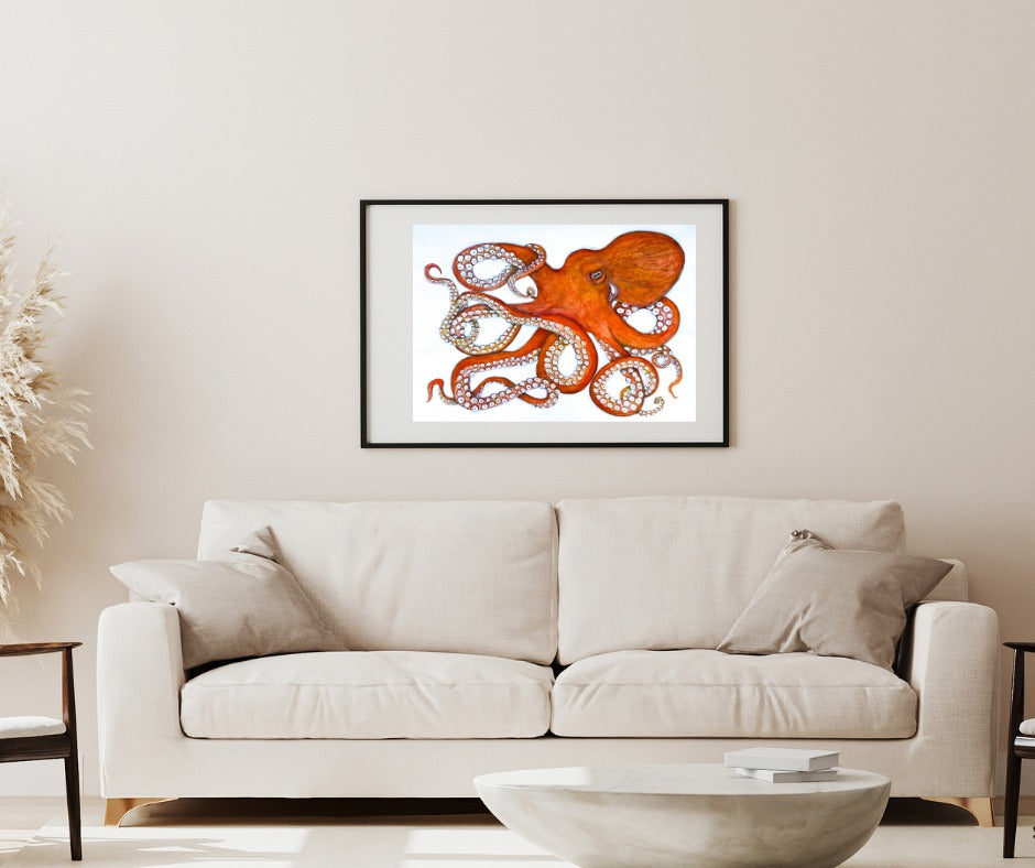 This bold watercolor captures the mystery and majesty of the Giant Pacific Octopus. Flowing washes of deep orange, copper and warm yellows bring the creature’s sinuous arms to life, while delicate details reveal its intelligence and grace. The play of light and shadow suggests movement through the ocean’s depths, evoking both power and elegance. At 22x30 inches, the piece makes a striking statement—an homage to one of the sea’s most fascinating inhabitants.