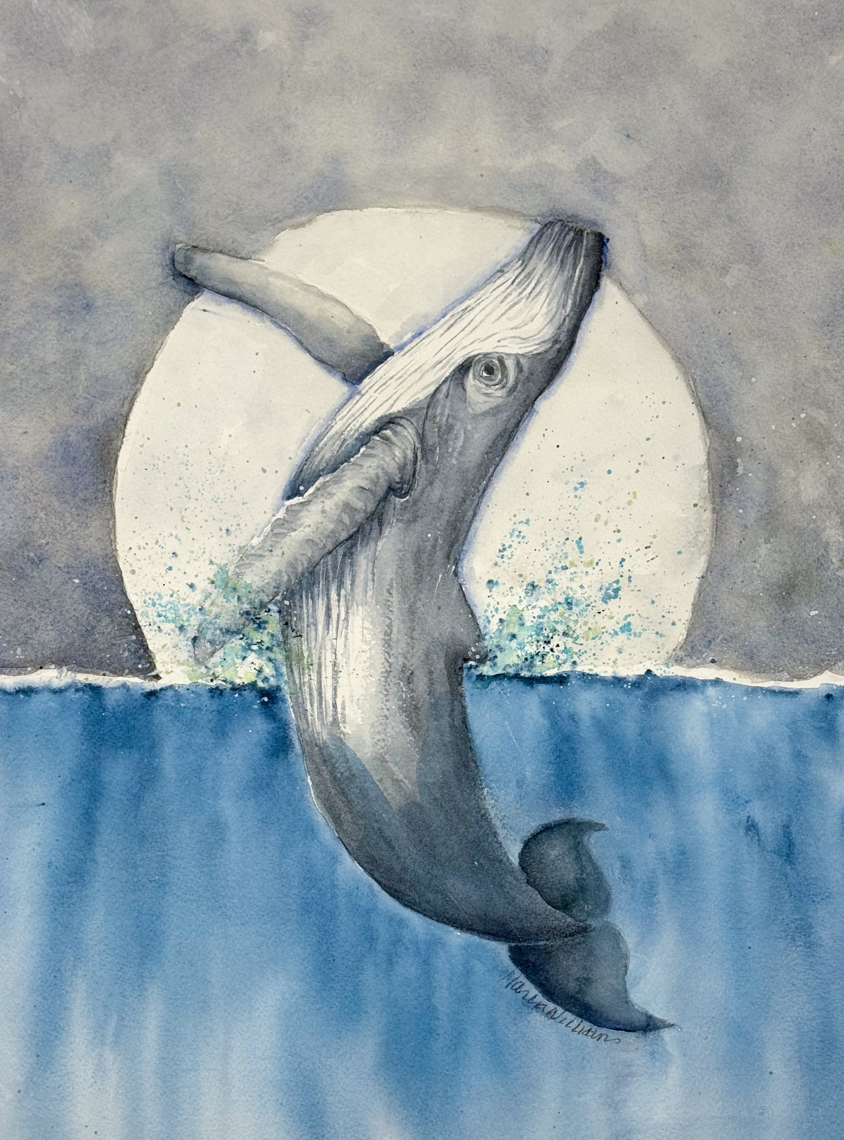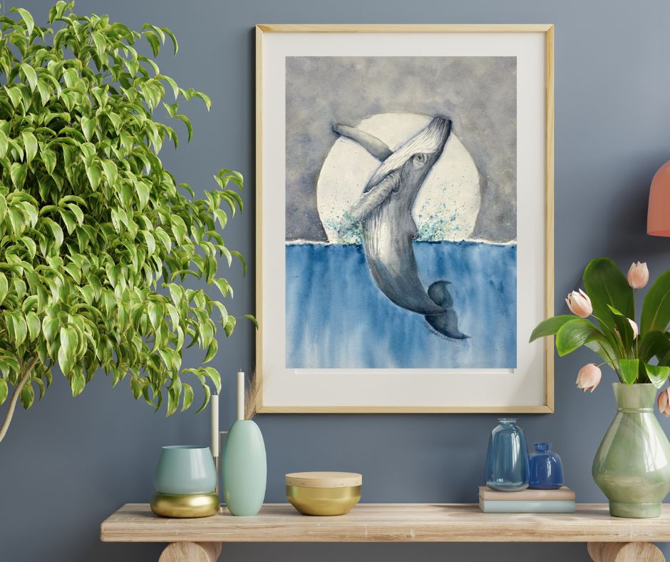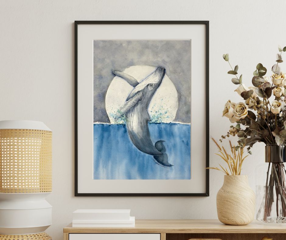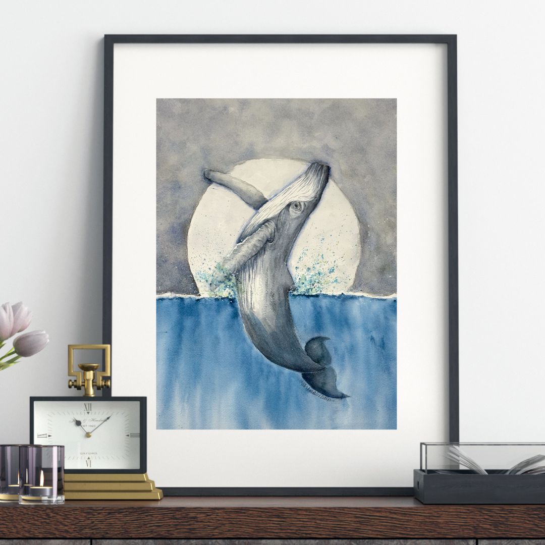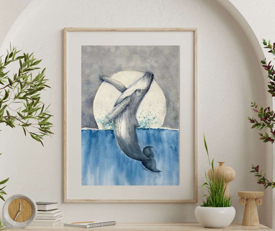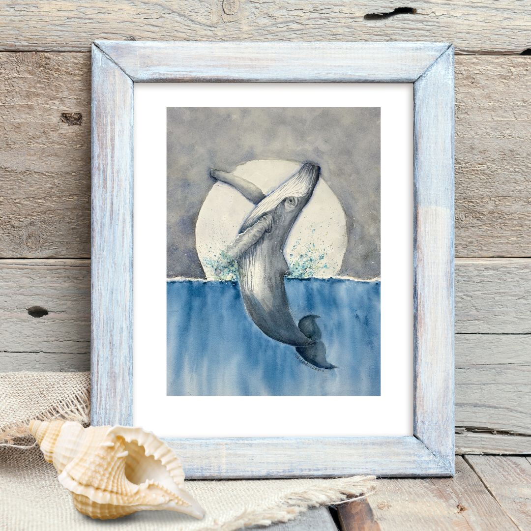 This watercolor captures a whale's majestic leap under a glowing moon. The cool blues and soft grays evoke serenity. This 12x16 is Ideal for any ocean lover.